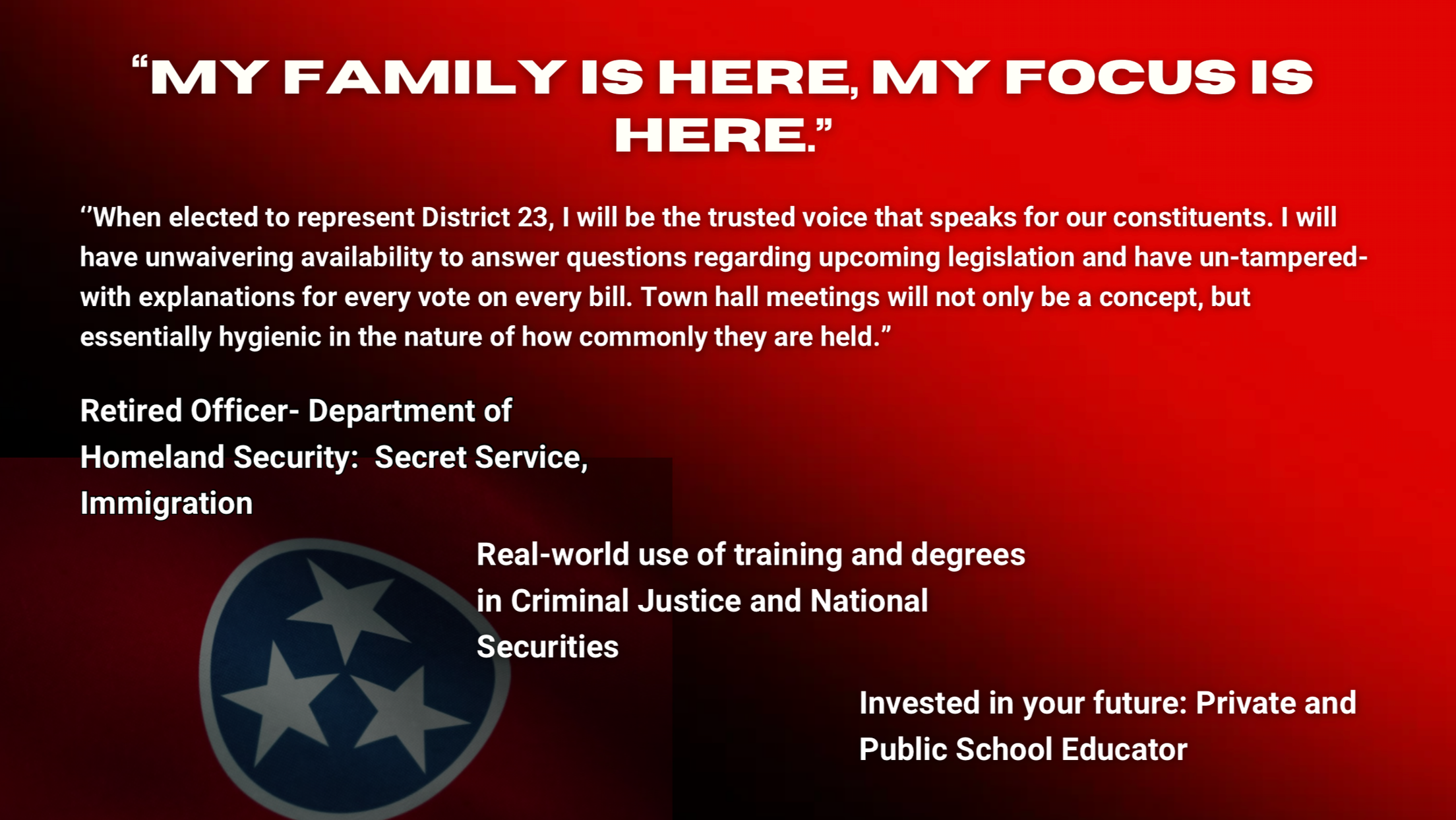 For too long the establishment politicians haven’t ACTUALLY shrunk the government’s involvement in our lives. I’m a conservative, I believe government should only be as large as is needed to effectively administer programs designated to it by the Tennessee State Constitution. I believe taxes should only be collected to support said limited responsibilities as outlined by the state constitution.